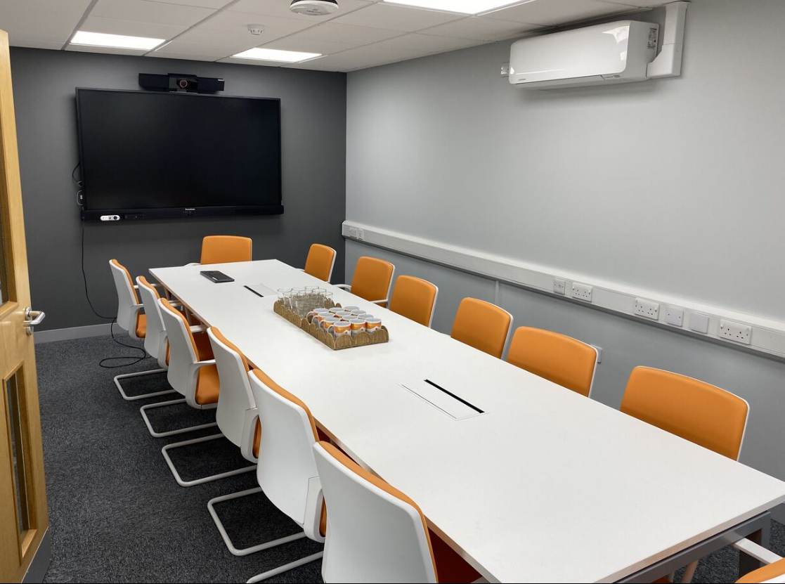 Meeting Room: Host your next successful meeting in our dedicated room, designed for up to 14 delegates. You'll find convenient in-table power access and the latest technology for effortless collaboration, including a Promethean screen for dynamic presentations and seamless connectivity.